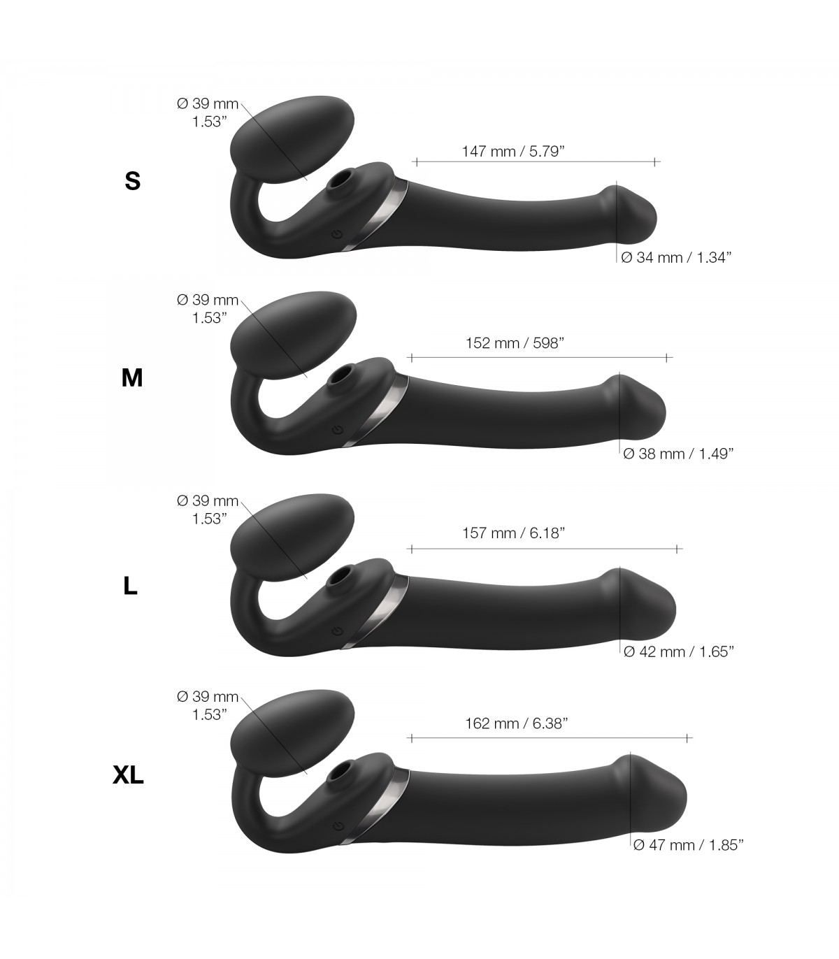 Medidas de ancho penetrante: S (3'4 cm), M (3'8 cm), L (4'2 cm) y XL (4'7 cm)