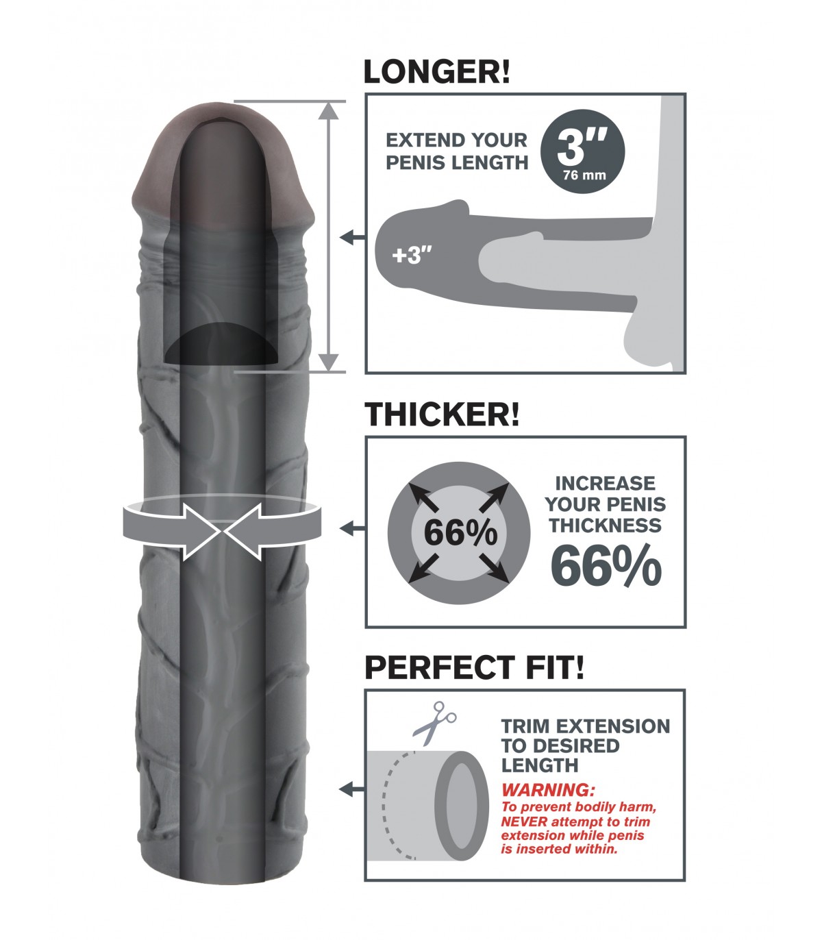 Convierte tu pene en una máquina de placer instantáneo con el increíble Fantasy X-Tensions®.Ahora puedes ser todo el hombre que quieras ser y satisfacer a tu pareja con este potenciador de la erección fácil de usar. Desarrollado como una alternativa segura, asequible y no quirúrgica a los costosos procedimientos médicos y píldoras, ¡Fantasy X-tension® te dará la vara de placer más grande, gruesa y satisfactoria que jamás hayas imaginado! Perfecto para hombres con disfunción eréctil y problemas de rendimiento a medio camino, ¡tu nuevo potenciador brindará resultados que a ambos miembros de la pareja les encantarán!La Mega 3" Extension es una extensión personalizable que se puede recortar fácilmente en la base para un ajuste perfecto. Es súper elástica para adaptarse a la mayoría de los tamaños y lo suficientemente cómoda para ayudarte a durar más. Tu pareja disfrutará de una penetración más profunda con la extensión de 3" en la punta, mientras que el eje ultra realista te hace un 66 % más grueso en todos los sentidos. El suave material Fanta Flesh® se siente como una segunda piel, lo que te brinda la longitud, el grosor y la confianza que necesitas para satisfacer a tu amante.• Extensión de 3 pulg. (76 mm)• Agrega un 66 % de circunferencia• Fanta Flesh ultra realista• Recortable para un ajuste perfecto